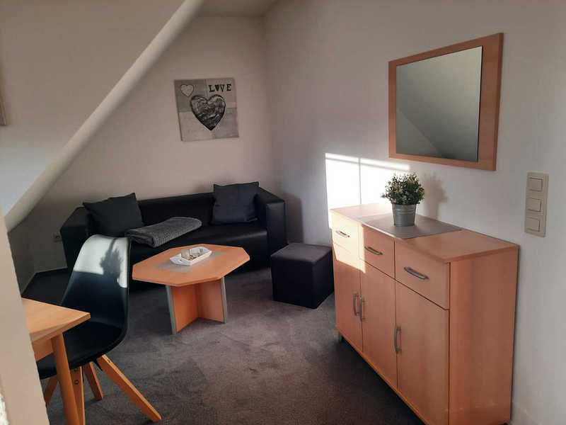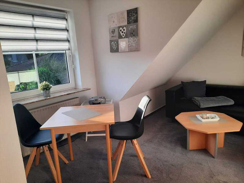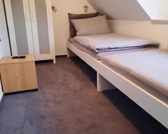 Monteurwohnung für 1-2 Personen, Schlafzimmer mit zwei Einzelbetten und Smart-TV, offener Wohn-Küchenbereich mit voll ausgestatteter Küche (4-Plattenherd und Backofen, Kühl-Gefrierkombination, Kaffeemaschine, Kaffeepadmaschine, Wasserkocher, Toaster, ...) und Smart-TV, helles Duschbad mit Waschmaschine. WLAN zur kostenfreien Nutzung. PKW-Stellplatz auf dem Grundstück.