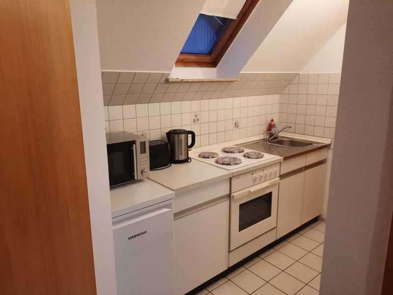Freundlich ausgestattete Monteurzimmer mit jeweils eigenem Flachbildfernseher. Drei Einzelzimmer teilen sich eine Küche und ein Duschbad.
