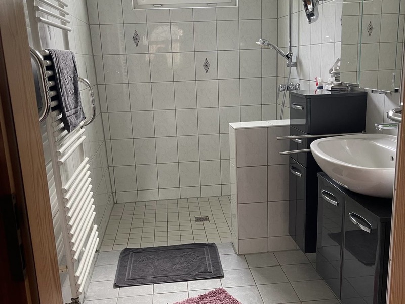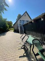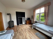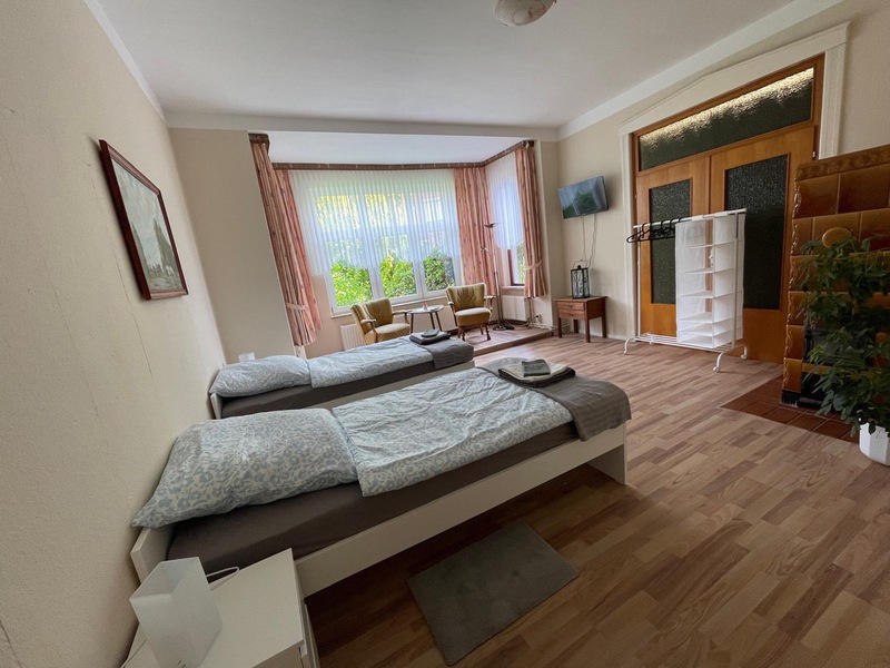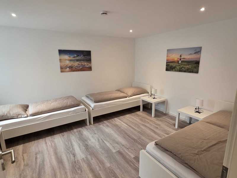 3 Schlafzimmer mit jeweils einem Flachbild-TV: 2 Schlafzimmer mit zwei Einzelbetten, 1 großes Einzelzimmer mit Tisch und Couchgarnitur. 1 Erker mit Sitzgelegenheiten, helles Duschbad und kleine Küche. Kostenfreies WLAN, PKW-Stellplätze vor und hinter dem Haus, Garten mit Grillplatz, Gemeinschaftswaschmaschine.