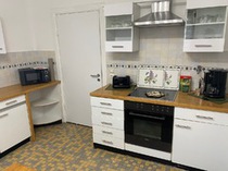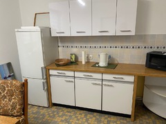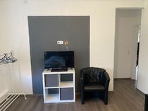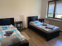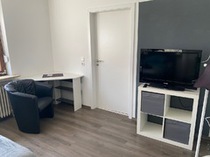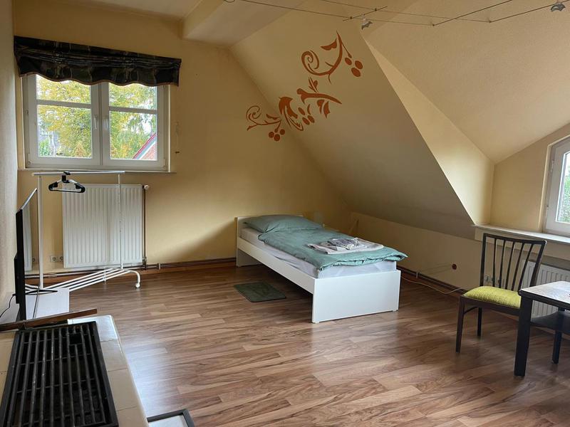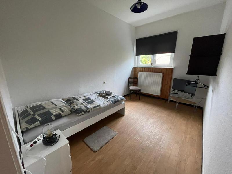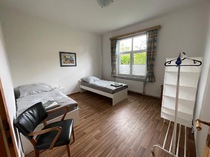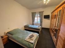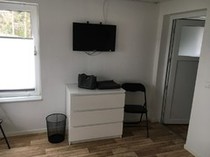 Wohn-Schlafzimmer mit 2 Einzelbetten, Flachbild-TV, Einzelzimmer mit Dusche ensuite, Küchenzeile, seperates WC. Kostenfreies WLAN, PKW-Stellplätze vor und hinter dem Haus, Garten mit Grillplatz, Gemeinschaftswaschmaschine.
