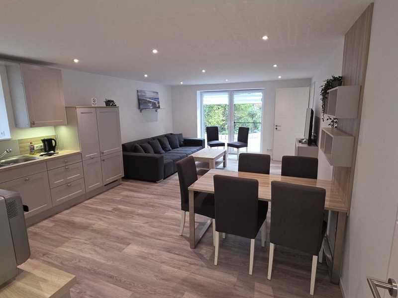 2 Schlafzimmer mit jeweils 2 Einzelbetten, großes Wohnzimmer mit TV, Einbauküche (inkl. Backofen, Geschirrspüler) und Essecke, Duschbad, kostenfreies WLAN, PKW-Stellplatz