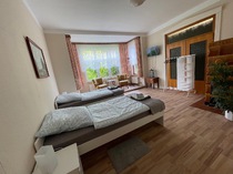 4 Schlafzimmer, Wohnzimmer mit TV, separate Küche, 2 Duschbäder, freies WLAN. Die Schlafzimmer sind jeweils mit einem Doppelbett (Belegung als Einzelzimmer) ausgestattet. In einem der Schlafzimmer befindet sich neben dem Doppelbett ein weiteres Einzelbett sowie eine Sitzecke mit TV.