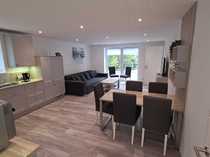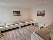 Cuxhaven Zentrum / Monteurwohnung für 5 Personen: Wohnzimmer mit 3er- und 2er Sitzgarnitur, Einzelbett und Flachbild-TV, zwei Schlafzimmer mit jeweils zwei Einzelbetten, voll ausgestattete große Wohnküche, helles Duschbad. Kostenfreies WLAN, PKW-Stellplätze vor und hinter dem Haus, Garten mit Grillplatz, Gemeinschaftswaschmaschine.