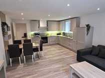 Wohnküche mit Ledercouch und Flachbild-TV. Zwei Einzelzimmer und ein helles Duschbad ensuite. Kostenfreies WLAN, PKW-Stellplätze vor und hinter dem Haus, Garten mit Grillplatz, Gemeinschaftswaschmaschine.